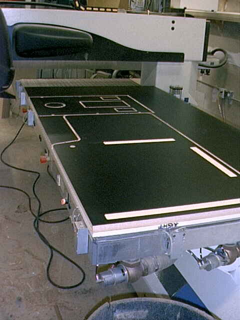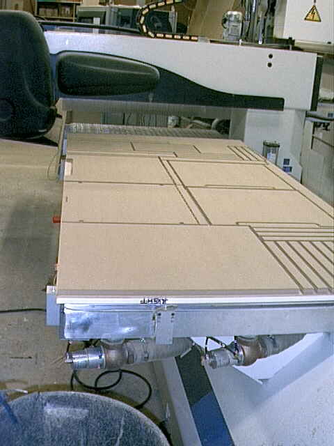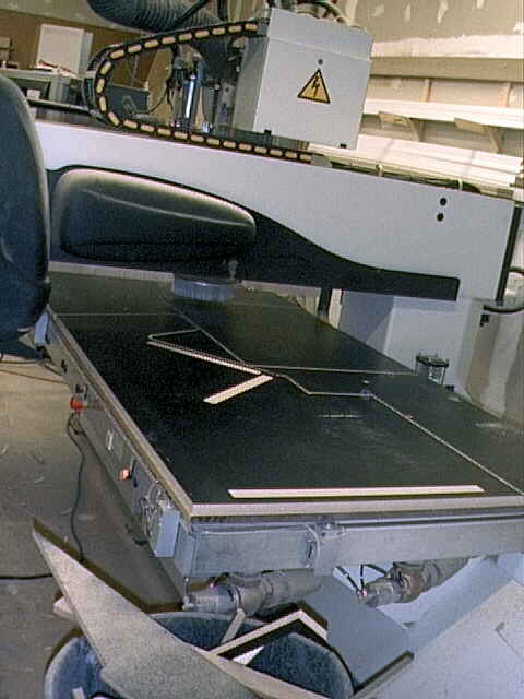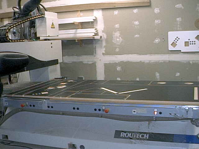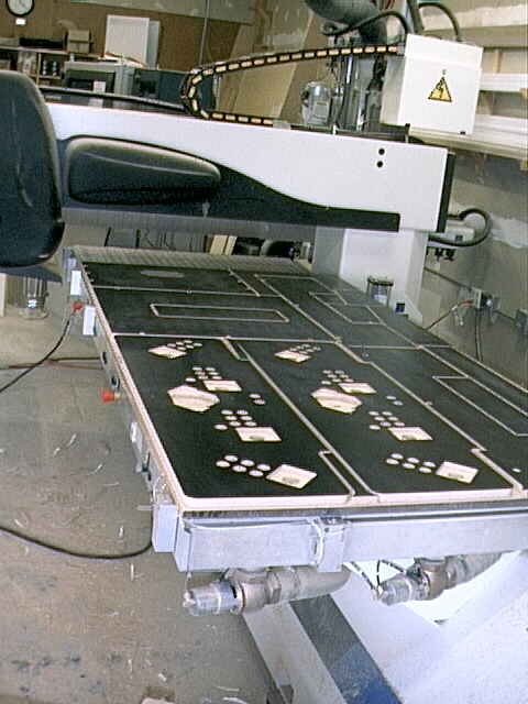 | Here is our professional cabinet shop with computerized router in action, carving out the cabinet parts | Here are some of the parts laid out ready for assembly |
